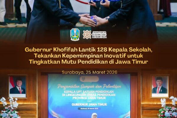 SURABAYA, 26 MARET 2026 – Gubernur Jawa Timur Khofifah Indar Parawansa melantik dan mengambil sumpah/janji jabatan 128 Kepala Sekolah SMA,…