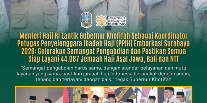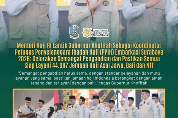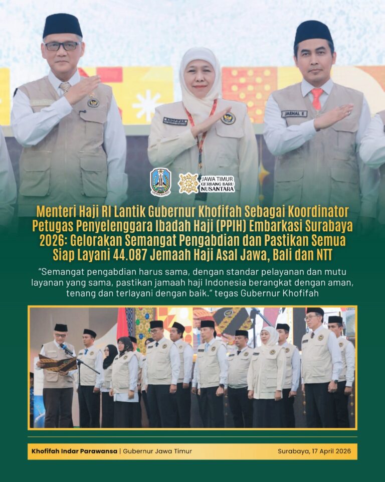 SURABAYA, 17 APRIL 2026 – Gubernur Jawa Timur Khofifah Indar Parawansa dilantik sebagai koordinator Petugas Penyelenggara Ibadah Haji (PPIH) Embarkasi…