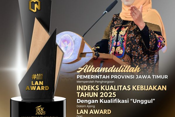 Pemerintah Provinsi Jawa Timur meraih penghargaan Indeks Kualitas Kebijakan (IKK) Award Tahun 2025 untuk kategori provinsi berkualifikasi unggul dari