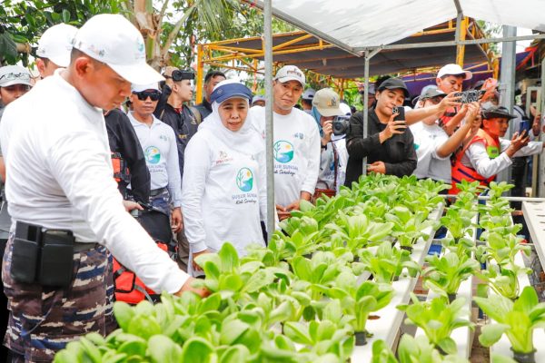 Gubernur Jawa Timur Khofifah Indar Parawansa bersama Pasukan Marinir Korps 2 TNI AL menggelar aksi susur dan bersih-bersih Kali Surabaya, Minggu (19/1