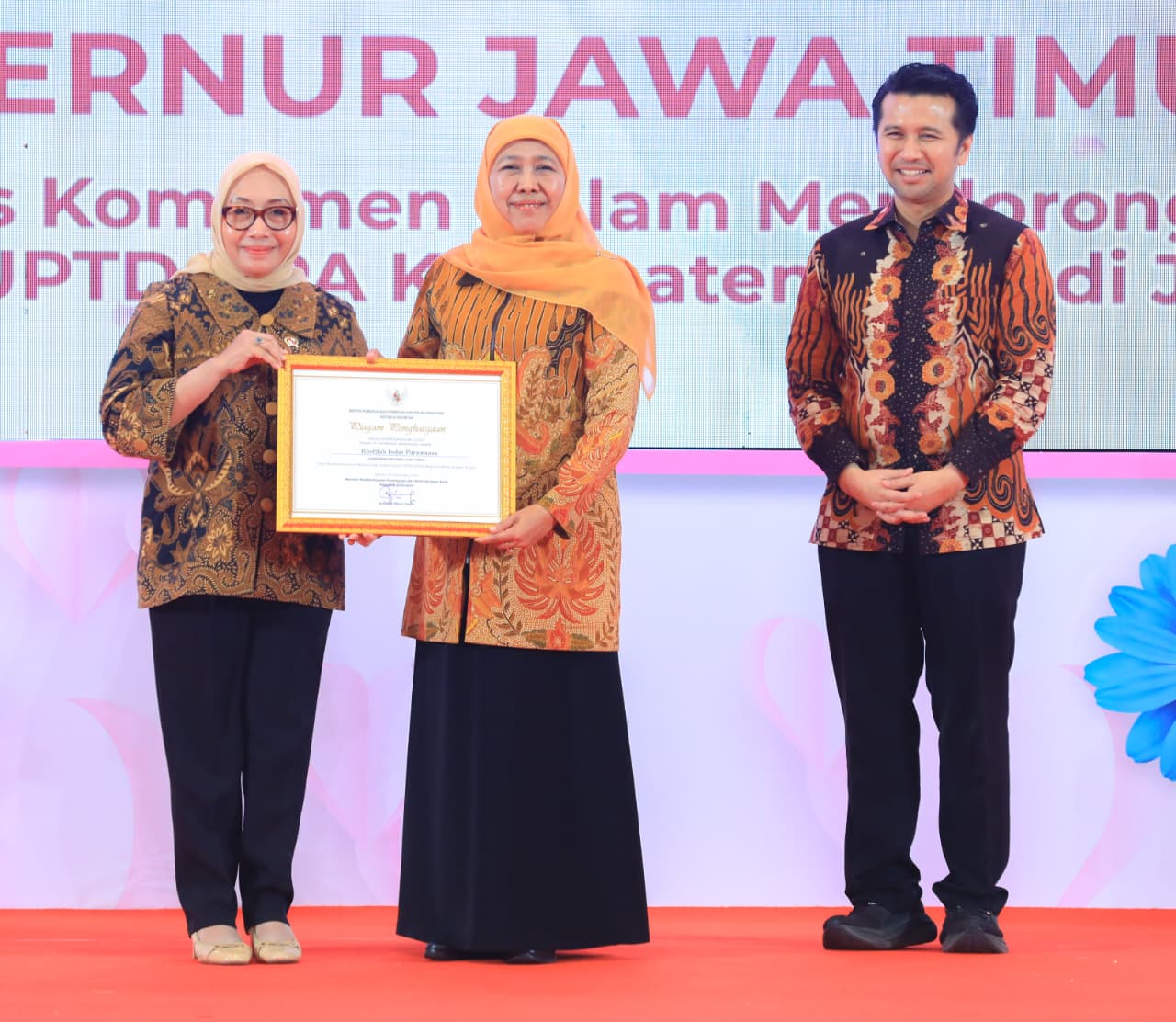 Atas pembentukan UPTD Perlindungan Perempuan dan Anak di Kabupaten Kota di Jawa Timur ini Gubernur Khofifah menerima Piagam Penghargaan Atas Komitmen Dalam Mendorong Pembentukan UPTD PPA Kab/Kota di Jawa Timur.