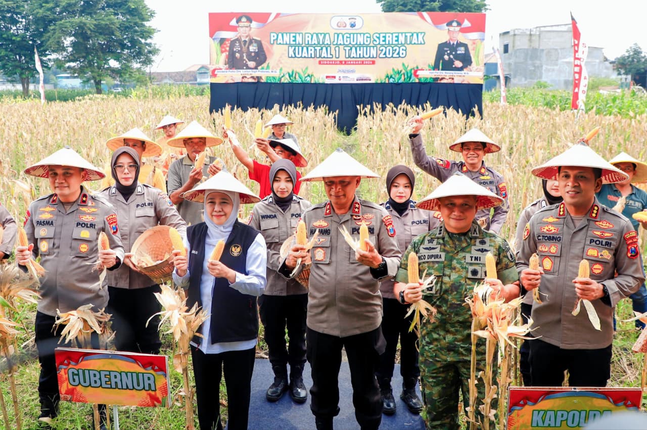 SIDOARJO, 9 JANUARI 2026 – Gubernur Jawa Timur Khofifah Indar Parawansa bersama  Kapolda  Jawa Timur menggelar Panen Raya Jagung Serentak Kuartal IV Tahun 2025  dalam rangka Mendukung Swasembada Pangan 2026 di Desa Kedensari, Kec. Tanggulangin, Kab. Sidoarjo, Kamis (8/1).