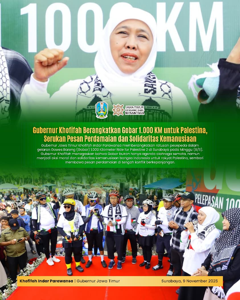 Gubernur Jawa Timur Khofifah Indar Parawansa memberangkatkan ratusan pesepeda yang tergabung dalam Gowes Bareng (Gobar) 1.000 Kilometer Ride For Palestine 2 di depan Kantor Gubernur Jawa Timur, Jalan Pahlawan 110 Surabaya, Minggu lalu.