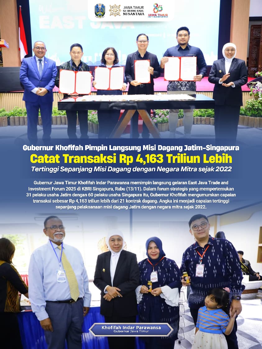 Sebagai informasi, neraca perdagangan antara Provinsi Jawa Timur dengan Singapura pada periode Januari – Agustus 2025, Jawa Timur mencatat surplus sebesar USD 379,19 juta, dengan nilai ekspor nonmigas mencapai USD 845,53 juta dan nilai impor sebesar USD 466,34 juta.