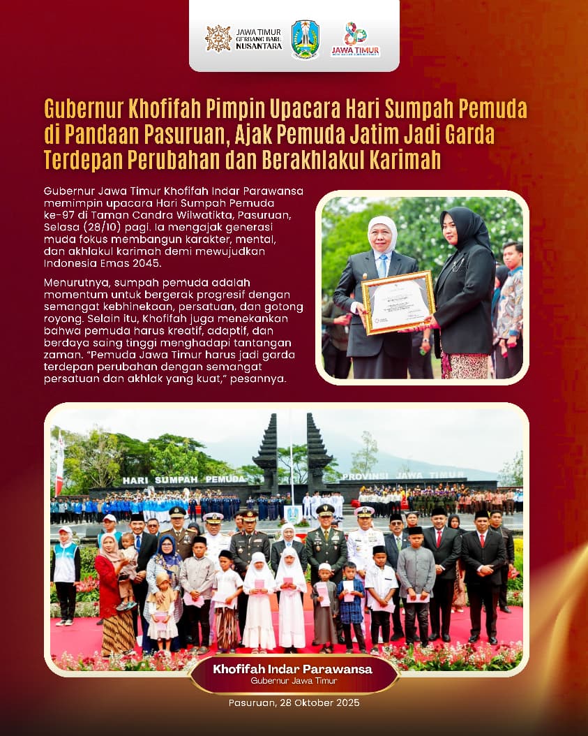 Sebagai informasi, dalam rangkaian Upacara Peringatan Sumpah Pemuda ke-97, Gubernur Khofifah menyerahkan penghargaan kepada Pemuda Pelopor, Pemuda Utama dan Pemuda Inspiratif Jawa Timur Tahun 2025.
