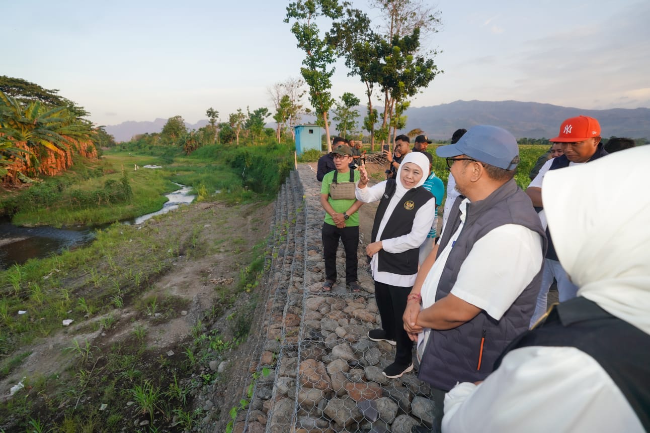 Gubernur Khofifah Indar Parawansa meninjau pemasangan bronjong di Sungai Selowogo, Desa Mlandingan Kulon, Kecamatan Mlandingan, Kabupaten Situbondo, Sabtu (27/9).