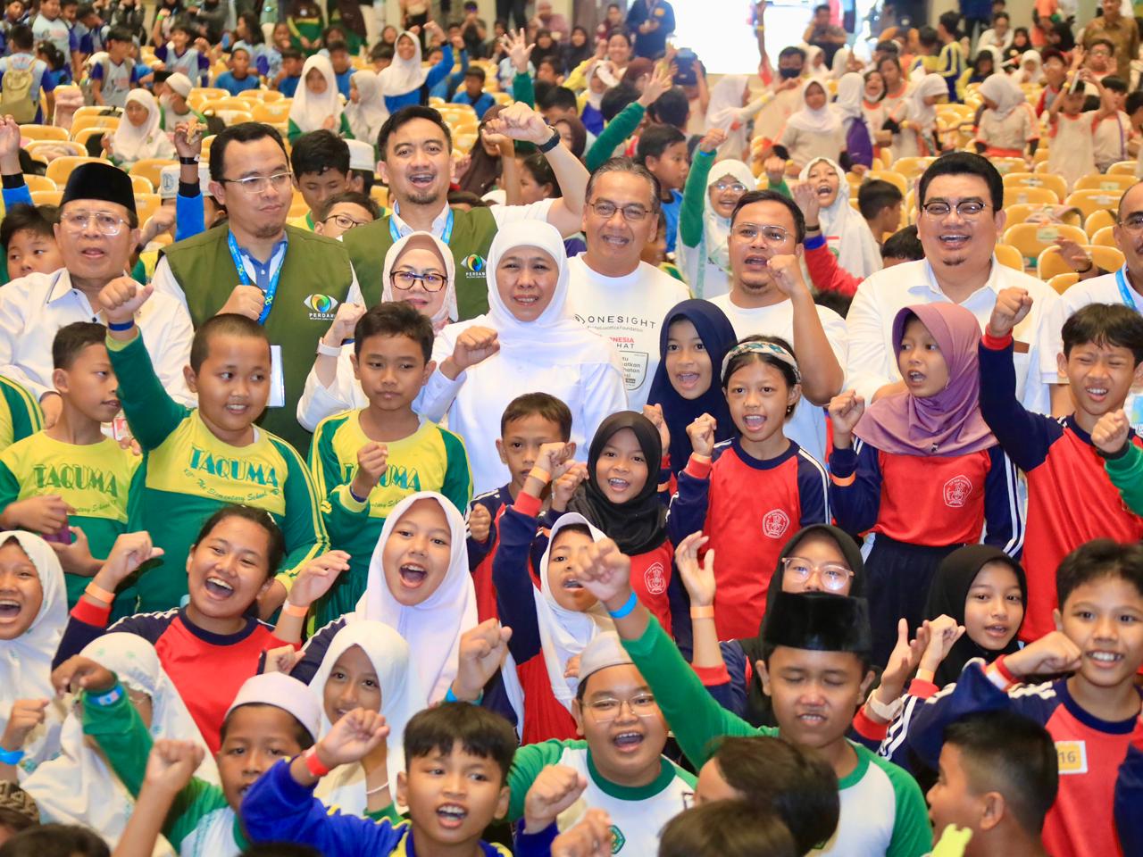 Gubernur Jawa Timur Khofifah Indar Parawansa memberikan apresiasi yang tinggi atas sinergi lintas elemen melakukan screening, pemeriksaan serta membagikan 1.000 kacamata gratis kepada anak-anak dari 12 Sekolah di Surabaya dalam rangkaian World Sight Day Tahun 2025 yang mengangkat tema “Bersatu Selamatkan Penglihatan Generasi” di Islamic Center Surabaya, Sabtu (11/10).