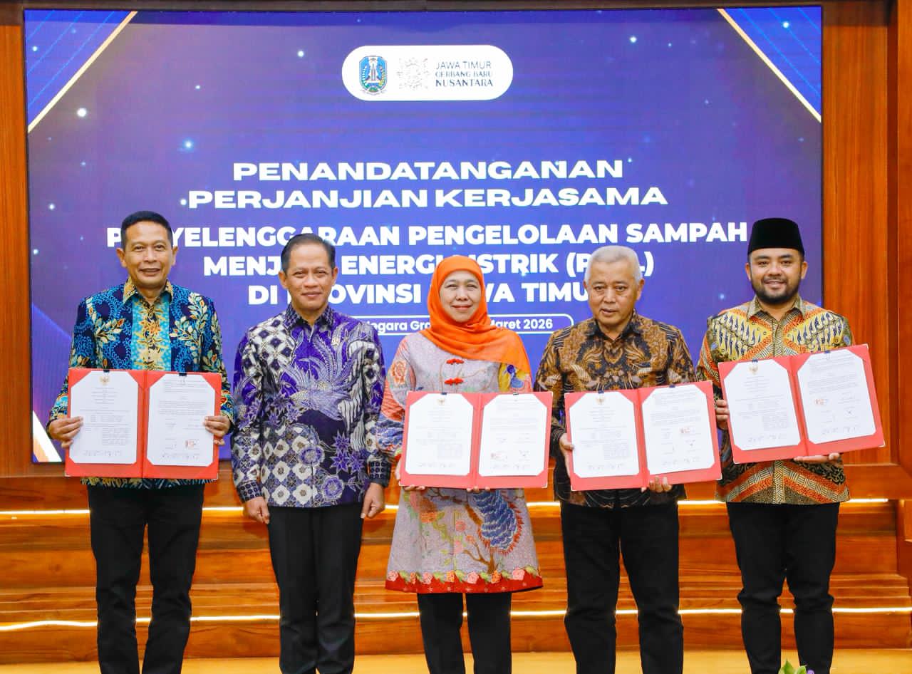 SURABAYA, 29 MARET 2026 – Gubernur Jawa Timur Khofifah Indar Parawansa menandatangani Perjanjian Kerja Sama (PKS) Pengolahan Sampah menjadi Energi Listrik (PSEL) bersama tujuh Bupati dan Wali Kota di kawasan Surabaya Raya dan Malang Raya di Gedung Negara Grahadi Surabaya, Sabtu (28/3) malam.