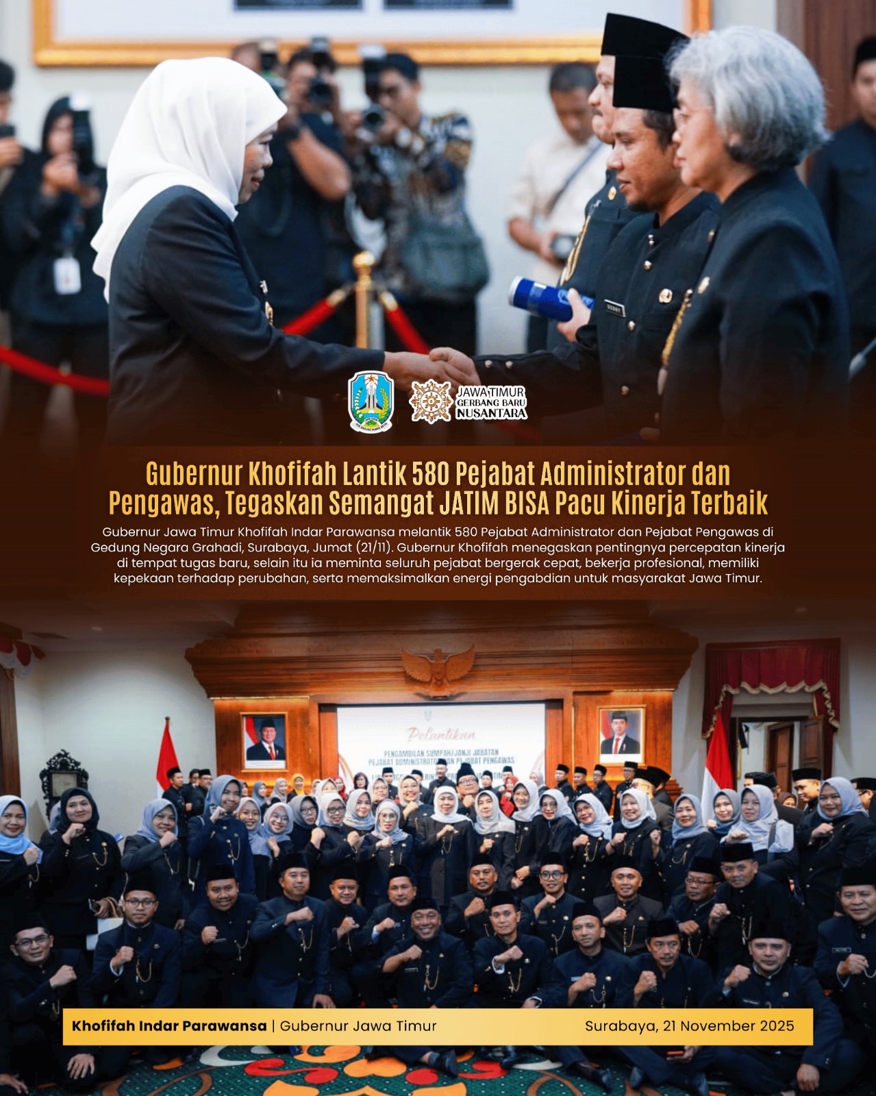 Gubernur Jawa Timur Khofifah Indar Parawansa melantik 580 Pejabat terdiri dari Pejabat  Administrator sebanyak 246 orang dan Pejabat  Pengawas sebanyak 334 orang di Gedung Negara Grahadi Surabaya, Jumat, (21/11).