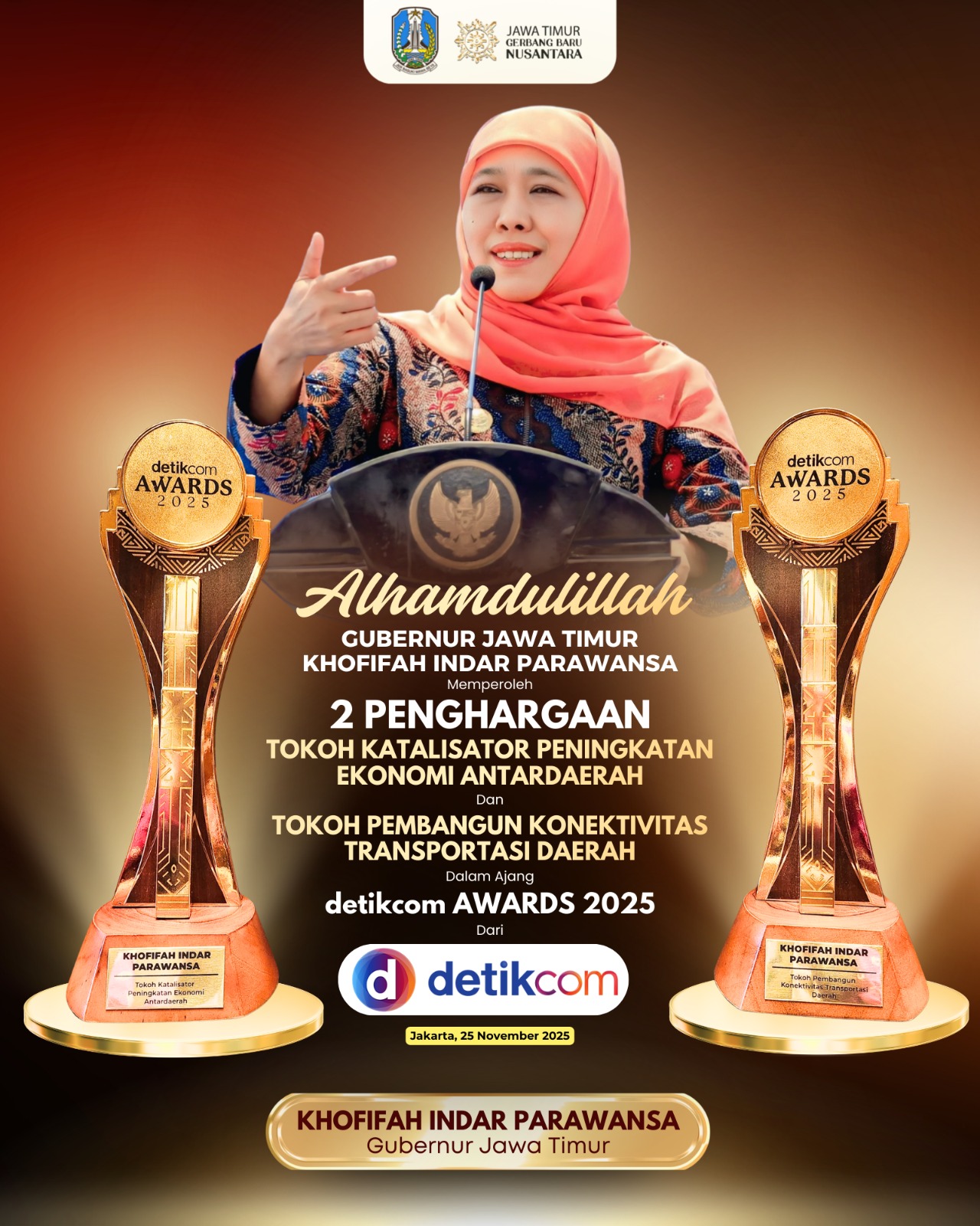 Dua program Gubernur Jawa Timur Khofifah Indar Parawansa yakni Misi Dagang dan Trans Jatim mendapat penghargaan nasional dari Detikcom Award 2025. Dua program ini menjadi pioneer ekonomi kerakyatan.