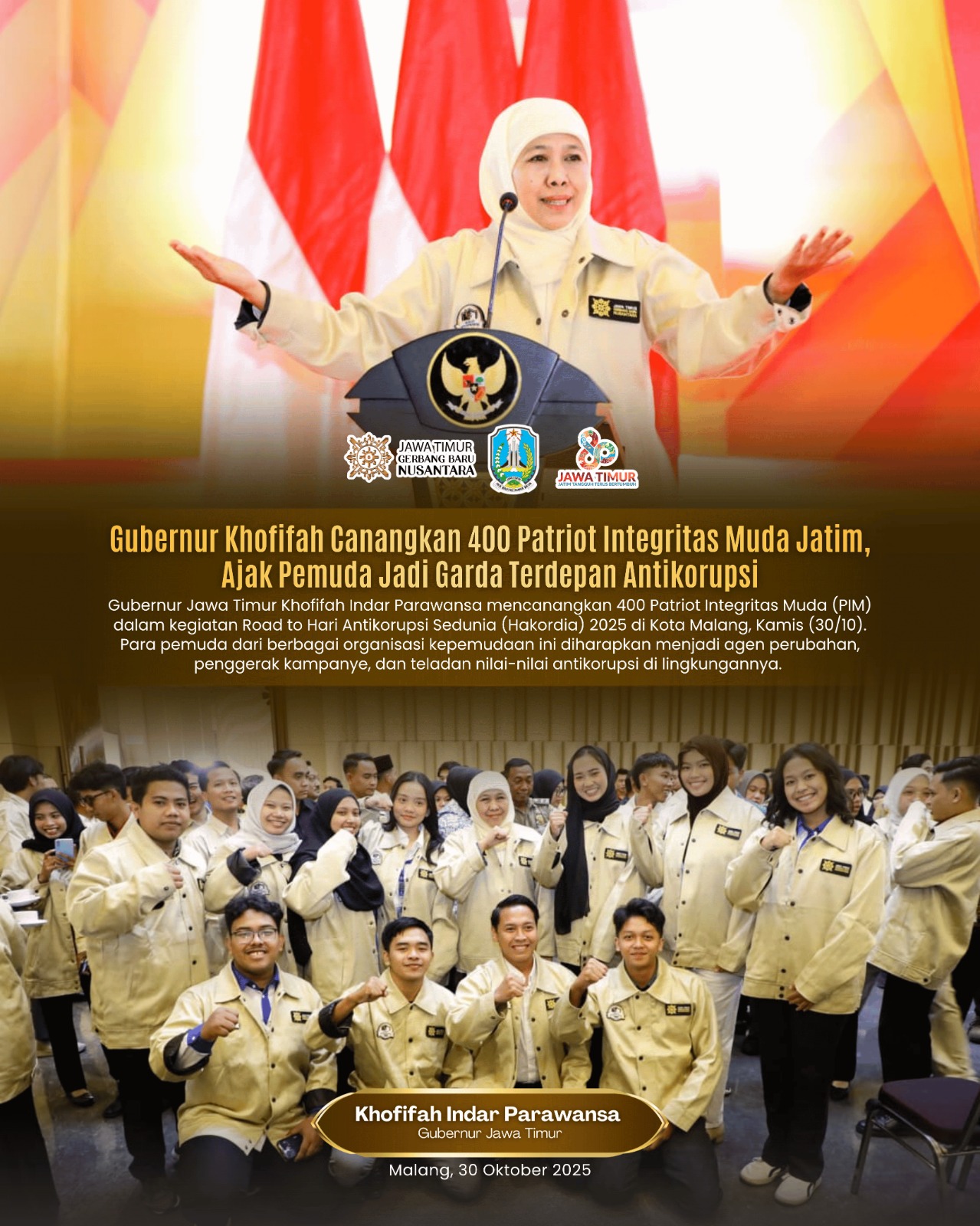 Di Jawa Timur, telah dikukuhkan sebanyak 400 Patriot Integritas Muda (PIM) Jawa Timur sebagai bagian Road to Hari Antikorupsi Sedunia (Hakordia) 2025 yang diselenggarakan oleh Inspektorat Provinsi Jawa Timur di Hotel Grand Mercure Malang, Kamis (30/10) lalu.
