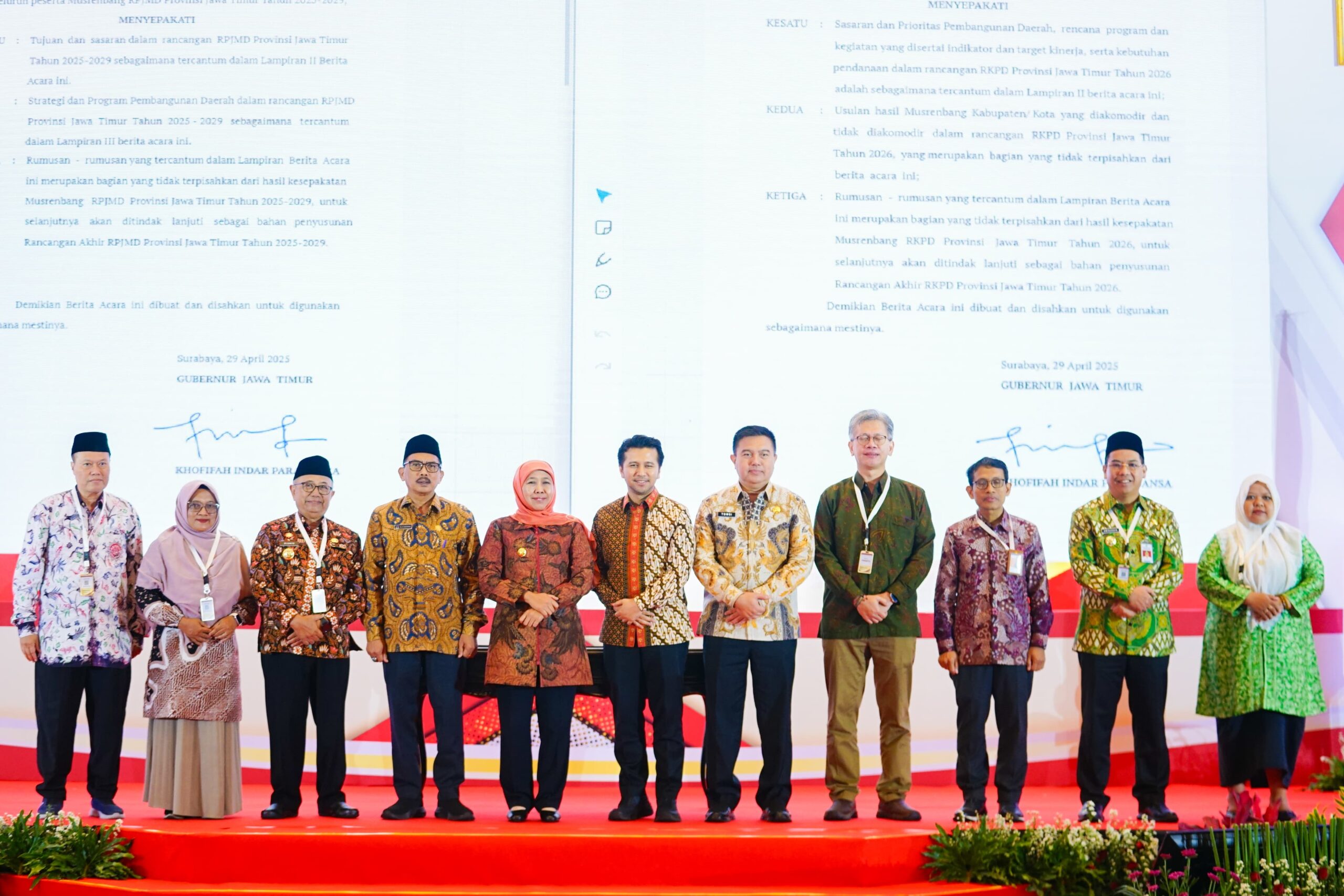Pada kesempatan ini juga dilakukan penandatanganan Berita Acara Musrenbang RPJMD Provinsi Jawa Timur Tahun 2025 – 2029 dan Rancangan RKPD Provinsi Jawa Timur Tahun 2026 oleh Gubernur Jawa Timur, Ketua DPRD Prov. Jatim, Sekjen Kemendagri, Deputi Bidang Kewilayahan BAPPENAS RI, Staf Ahli Bidang Pengeluaran Negara Kemenkeu.