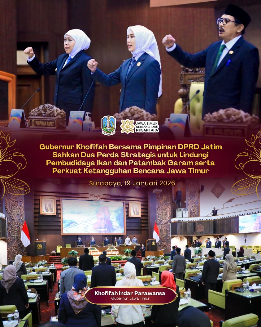 SURABAYA, 20 JANUARI 2026 – Gubernur Jawa Timur Khofifah Indar Parawansa bersama Pimpinan DPRD Jatim resmi mengesahkan dua Peraturan Daerah (Perda) strategis dalam Rapat Paripurna di Gedung DPRD Provinsi Jawa Timur, Senin (19/1).