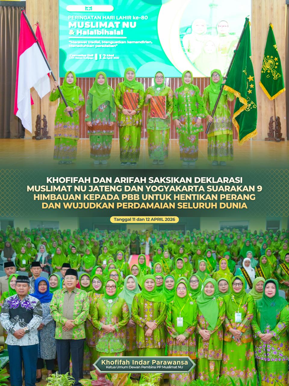 YOGYAKARTA, 13 APRIL 2026 – Ketua Umum Dewan Pembina PP Muslimat NU, Khofifah Indar Parawansa dan Arifah Choiri Fauzi sebagai Ketua PP Muslimat NU  menyaksikan pembacaan deklarasi PW Muslimat NU Jawa Tengah dan Daerah Istimewa Yogyakarta yang berisi sembilan imbauan kepada Perserikatan Bangsa-Bangsa (PBB) untuk segera menghentikan perang dan mendorong terwujudnya perdamaian dunia sebagai wujud komitmen moral terhadap kemanusiaan secara global.