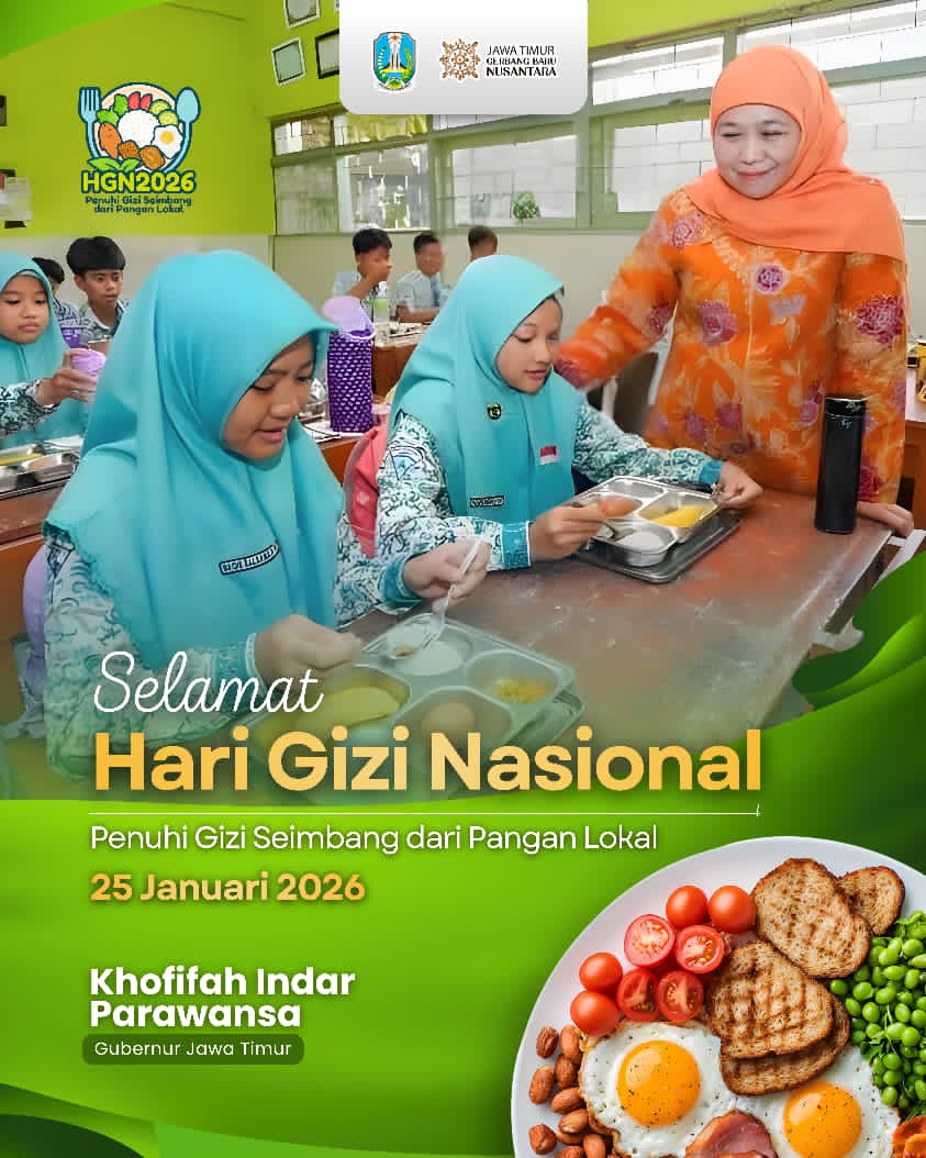 SURABAYA, 25 JANUARI 2026 – Gubernur Jawa Timur Khofifah Indar Parawansa menegaskan komitmen Pemerintah Provinsi Jawa Timur dalam memperkuat pembangunan gizi masyarakat pada peringatan Hari Gizi Nasional (HGN) Tahun 2026.