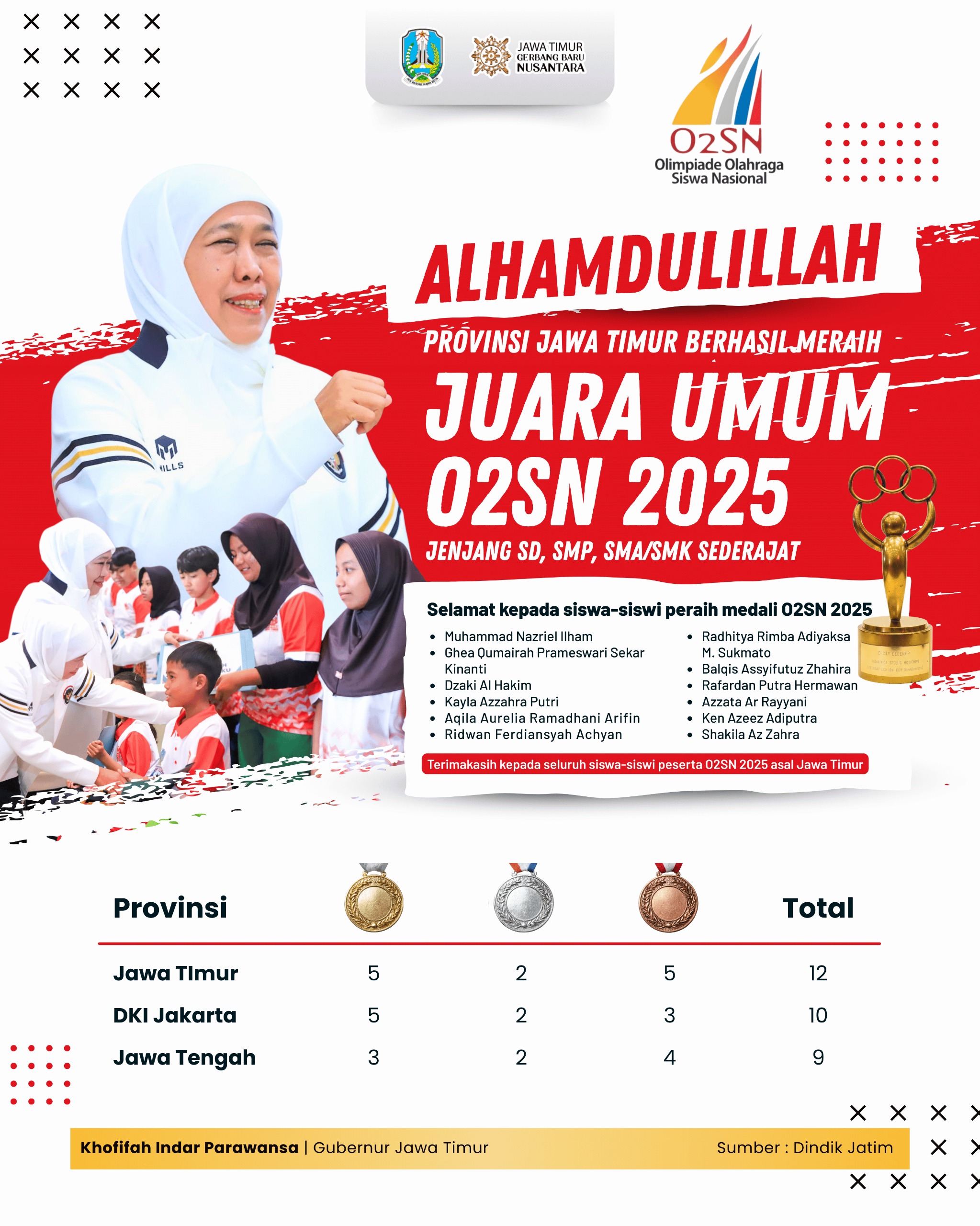 Provinsi Jawa Timur kembali menorehkan prestasi membanggakan dengan menjadi Juara Umum Olimpiade Olahraga Siswa Nasional (O2SN) Tahun 2025.