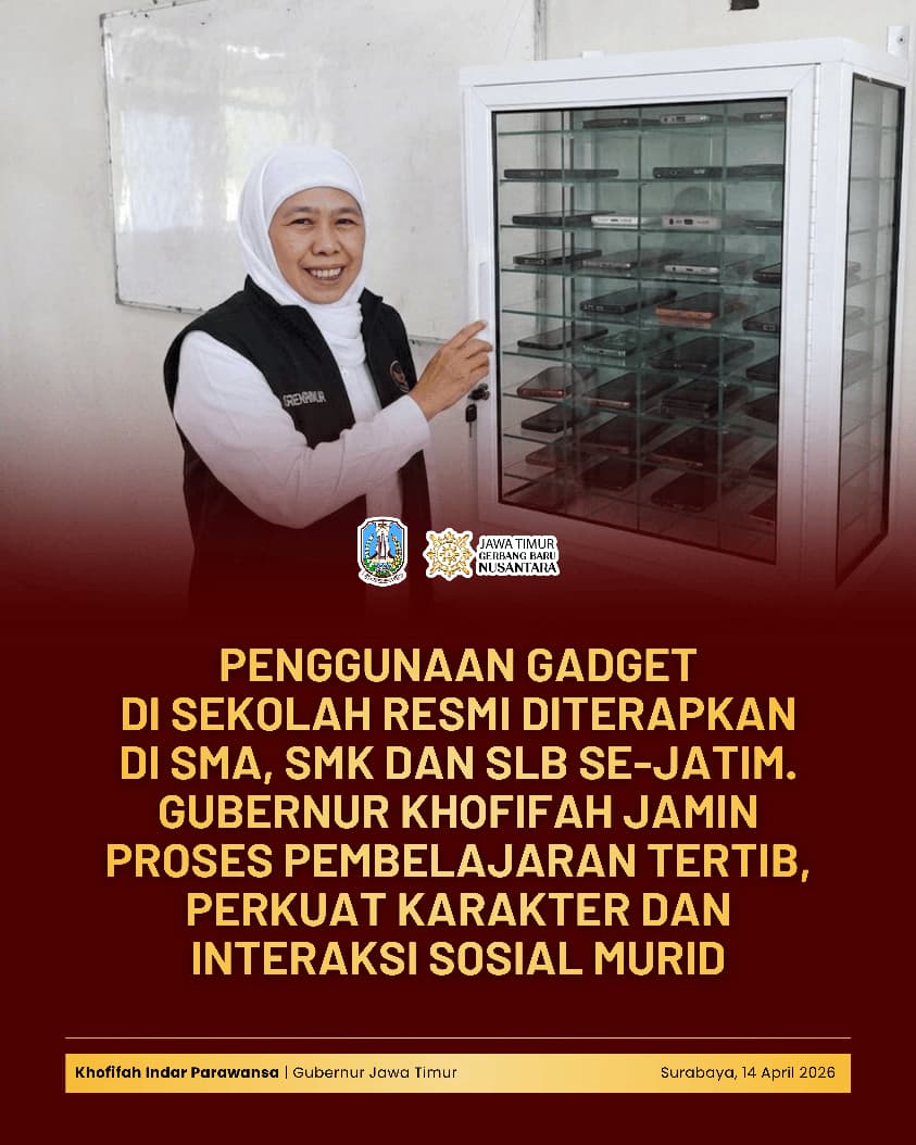 SURABAYA, 14 APRIL 2026 – Pemerintah Provinsi Jawa Timur melalui Dinas Pendidikan resmi memberlakukan penerapan kebijakan penggunaan gadget bagi murid dan guru di jenjang Sekolah Menengah Atas (SMA), Sekolah Menengah Kejuaran (SMK) dan Sekolah Luar Biasa (SLB).