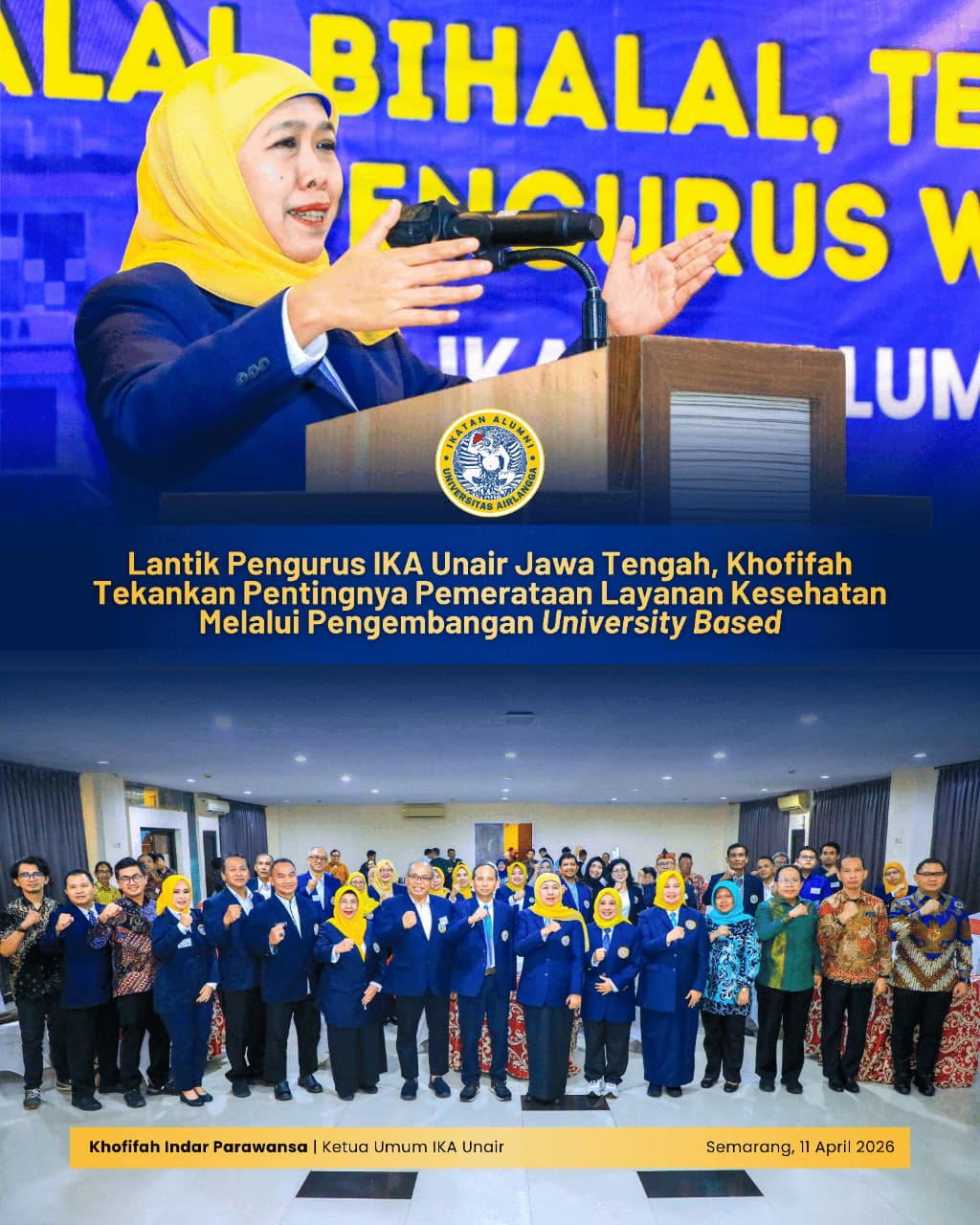 SEMARANG, 12 APRIL 2026 – Ketua Umum Pengurus Pusat Ikatan Keluarga Alumni (IKA) Universitas Airlangga (UNAIR) yang juga Gubernur Jawa Timur Khofifah Indar Parawansa melantik Pengurus Wilayah IKA UNAIR Jawa Tengah di UTC Convention Hotel, Semarang, Sabtu (11/4).