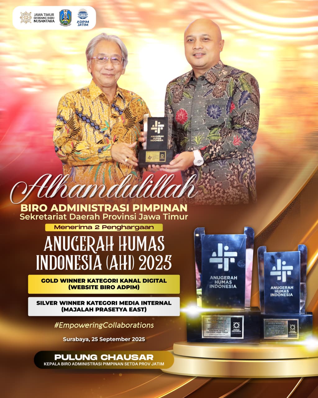 SURABAYA, 26 SEPTEMBER 2025 – Biro Administrasi Pimpinan Sekretariat Daerah Provinsi Jawa Timur menorehkan prestasi membanggakan dengan meraih dua penghargaan bergengsi dalam ajang Anugerah Humas Indonesia (AHI) 2025 yang digelar di Ballroom Hotel JW Marriott Surabaya, Rabu (26/9) malam.