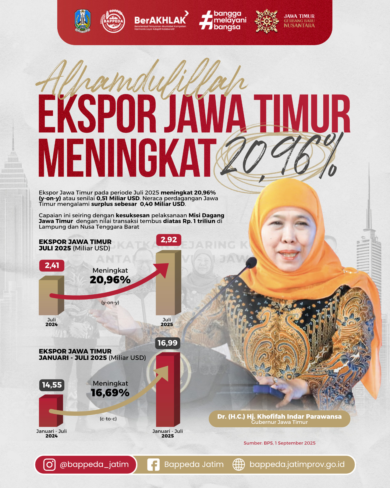 “Alhamdulillah, nilai ekspor Jatim (y-on-y) naik 20,96 persen pada Juli 2025. Ini instrumen yang baik untuk terus memacu pertumbuhan ekonomi Jatim,” kata Khofifah Selasa (2/9/2025).