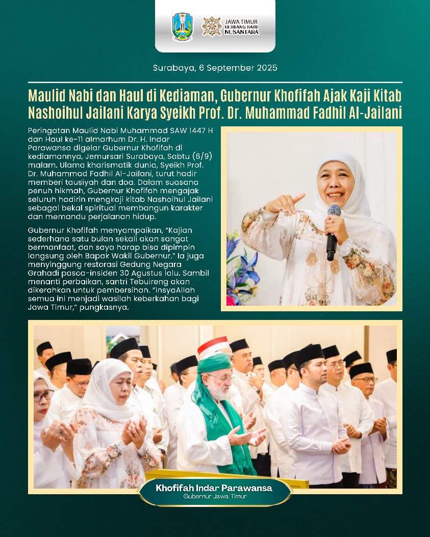 Gubernur Jawa Timur Khofifah Indar Parawansa menyelenggarakan Peringatan Maulid Nabi Muhammad SAW sekaligus Haul ke-11 almarhum Dr. H. Indar Parawansa di kediamannya, Jemursari, Surabaya, Sabtu (6/9). Acara ini menghadirkan ulama kharismatik dunia, Syeikh Prof. Dr. Muhammad Fadhil Al-Jailani, pentahkik tafsir Al Jailani yang juga memberikan tauziyah dan doa bagi masyarakat Jawa Timur.