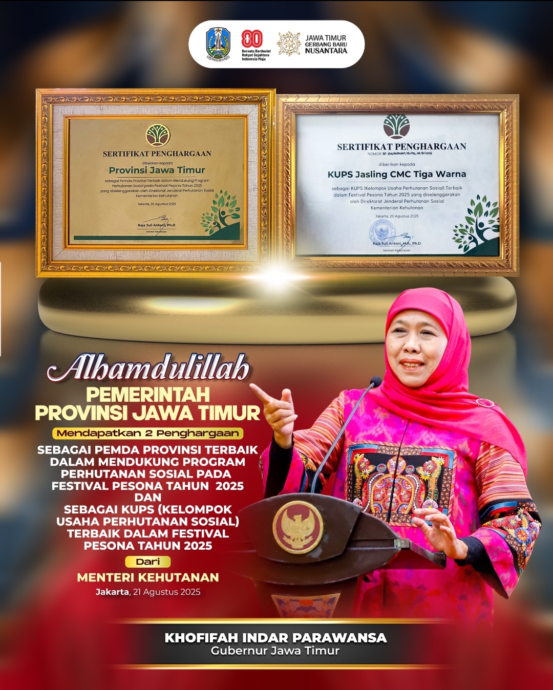 Gubernur Jatim Khofifah Indar Parawansa menyampaikan pesan dan rasa bangganya atas capaian tersebut. Penghargaan yang diterima ini sekaligus menjadi motivasi ke depan dalam mendukung perhutanan sosial.