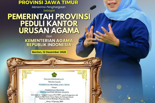 SURABAYA, 14 DESEMBER 2025 – Pemerintah Provinsi Jawa Timur menerima penghargaan Anugerah Layanan Kantor Urusan Agama (KUA) 2025 sebagai Pemerin