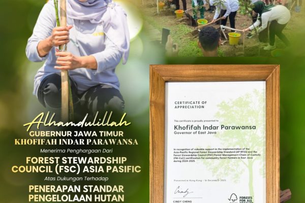 SURABAYA, 17 Desember 2025 – Gubernur Jawa Timur Khofifah Indar Parawansa meraih penghargaan dari Forest Stewardship Council (FSC) Asia Pacific